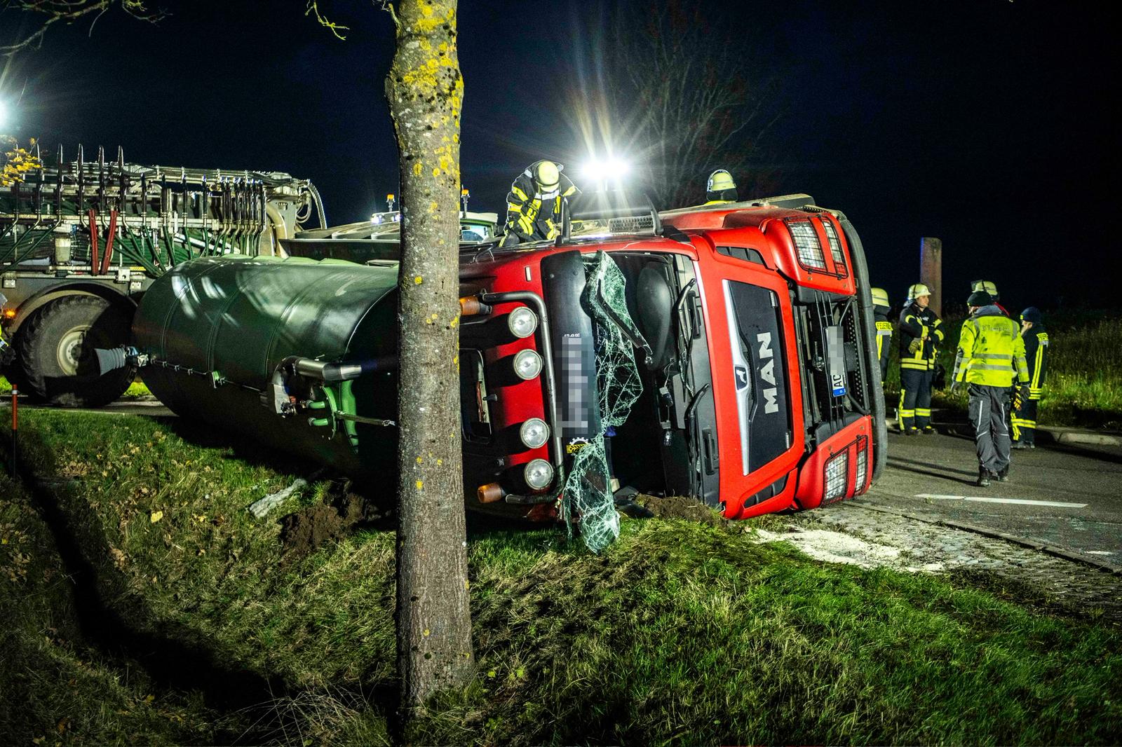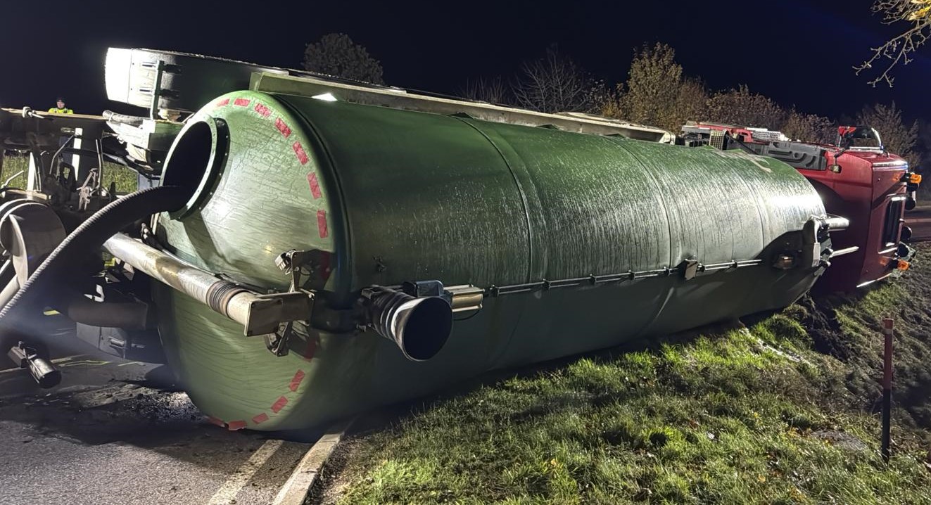 Nettersheim, 24 października 2025 r. – W Nettersheim-Zingsheim doszło do groźnego wypadku z udziałem 29-letniego kierowcy ciężarówki z Aachen, przewożącego gnojowicę. Kierowca podczas jazdy trasą L115 w kierunku ronda L115/L206 zasnął na krótko, wjechał w rondo z pełną prędkością i przewrócił pojazd. Część przewożonej gnojowicy rozlała się na jezdnię, a kierowca doznał poważnych obrażeń i został przewieziony do szpitala.