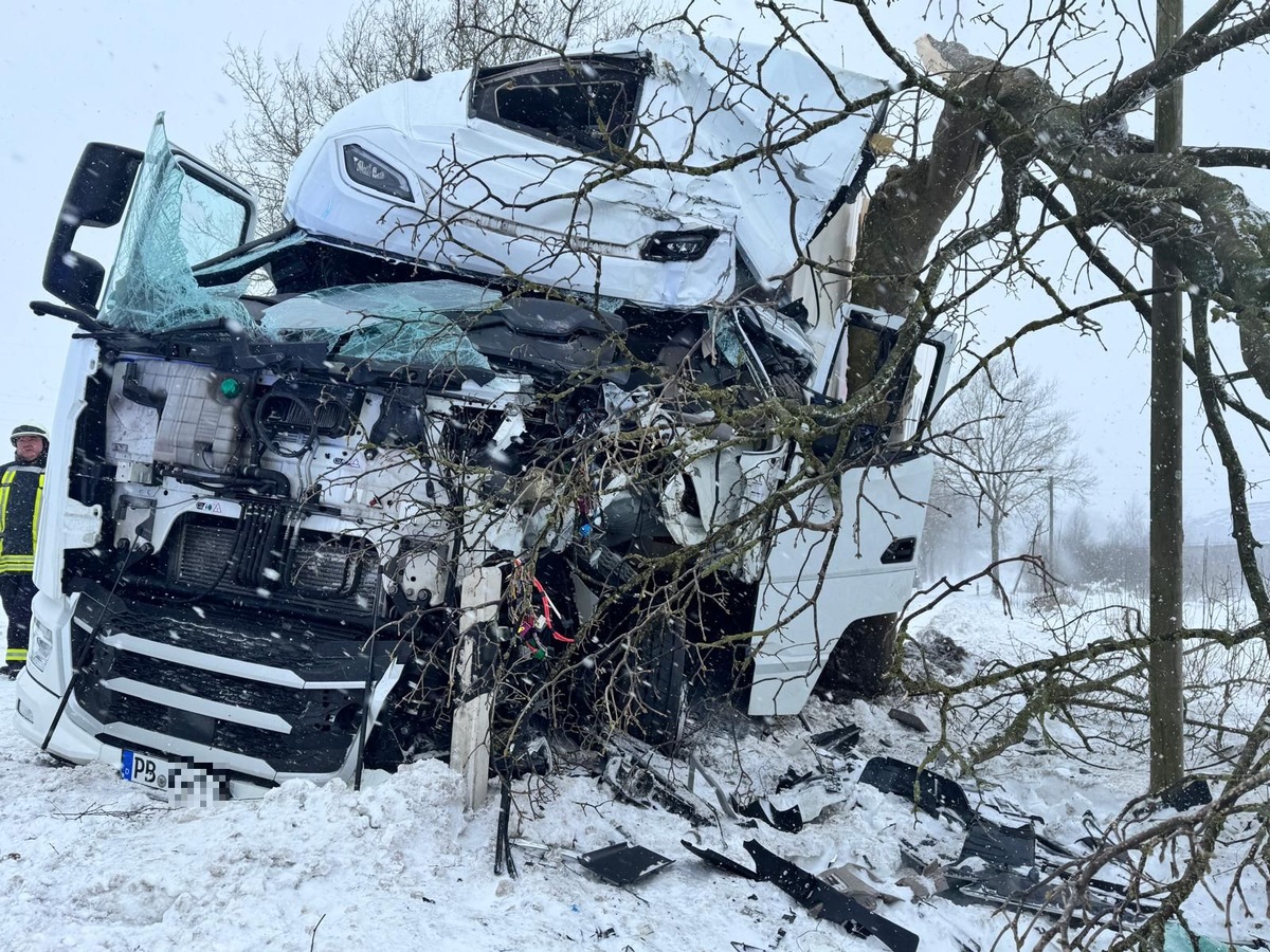 Na śliskiej, zimowej nawierzchni kierowca zdecydował się na wyprzedzanie dwóch pojazdów osobowych jadących przed nim. W trakcie manewru stracił panowanie nad ciężarówką. Pojazd zjechał na lewą stronę jezdni i z dużą siłą uderzył w przydrożne drzewo.