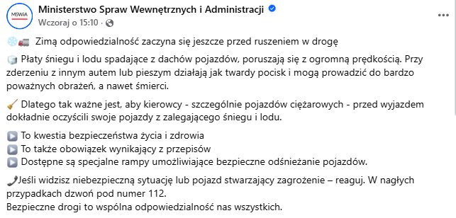 Ministerstwo podkreśla, że szczególną odpowiedzialność ponoszą kierowcy pojazdów ciężarowych i apeluje, aby przed wyjazdem dokładnie oczyszczali swoje pojazdy z zalegającego śniegu i lodu: