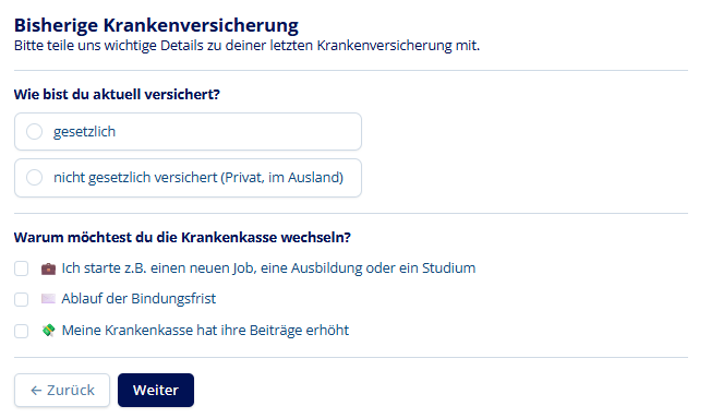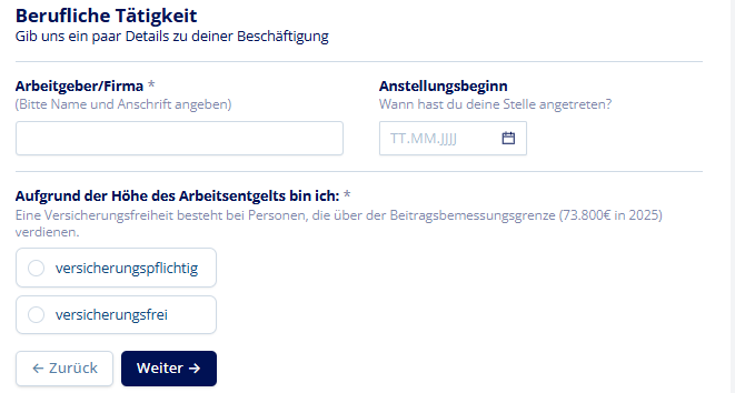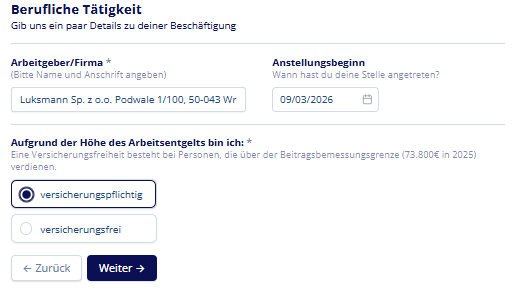 Kolejny punkt:musisz zaznaczyć, czy bazując na swojej sytuacji kwalifikujesz się do obowiązkowego ubezpieczenia: versicherungspflichtig