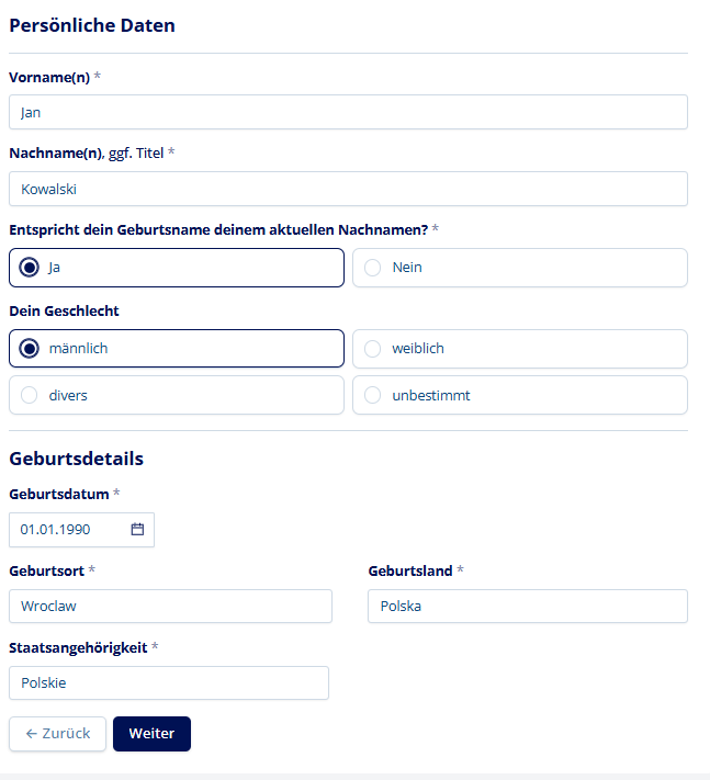1. Uzupełnij swoje dane personalne: są to kolejno: płeć, data urodzenia, imię, nazwisko, zapytanie czy Twoje nazwisko rodowe jest takie samo, jak obecne, miejsce urodzenia, kraj urodzenia, narodowość.