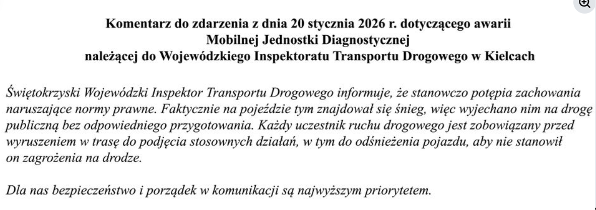 Inspektorat podziękował też użytkownikom internetu za zgłoszenie tej sytuacji, podkreślając, że każdy sygnał od obywateli może przyczynić się do jeszcze lepszego nadzoru nad stanem technicznym sprzętu służbowego i warunkami pracy na drogach.